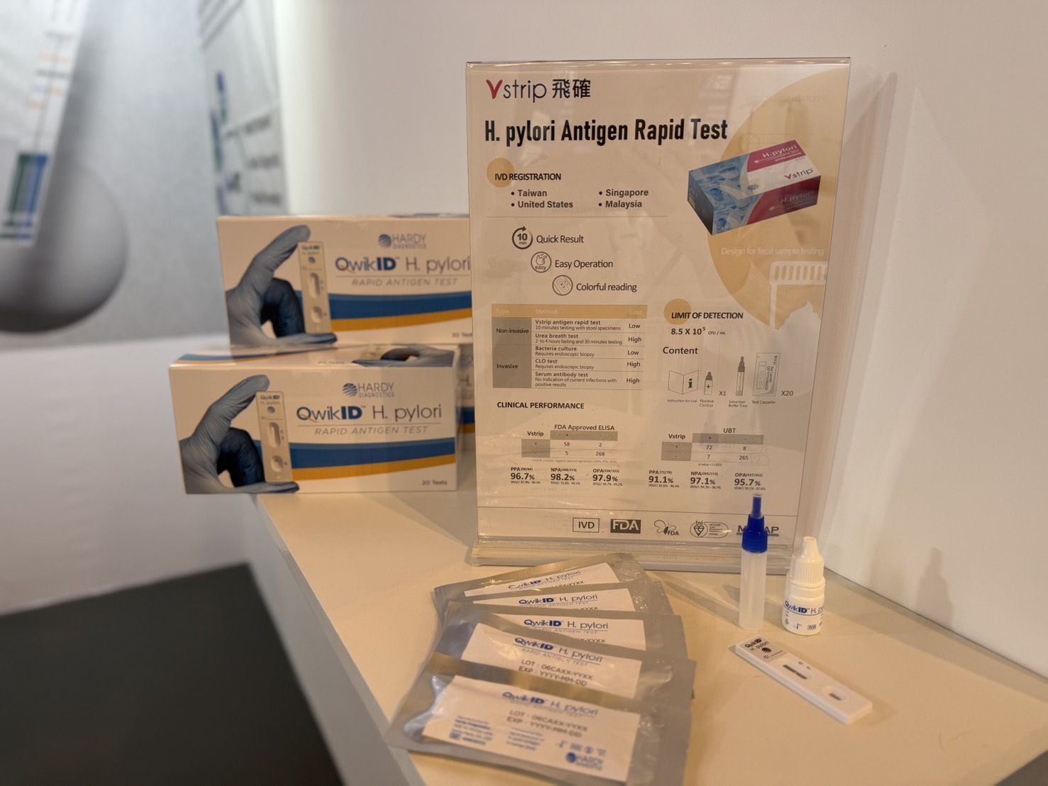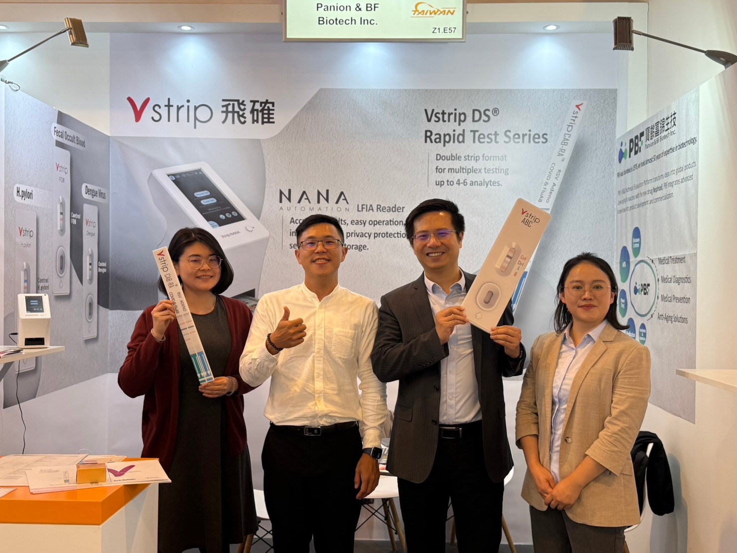 在本次展會中,Vstrip 展示了多款 快速檢測試劑(Rapid Test Kits)與 智慧判讀儀(NANA LFIA Reader),涵蓋幽門螺旋桿菌(H. pylori)、糞便潛血(FOB)、登革熱病毒(Dengue Virus)等多項檢測項目,能在短時間內提供精準結果,協助醫療人員迅速做出臨床決策。